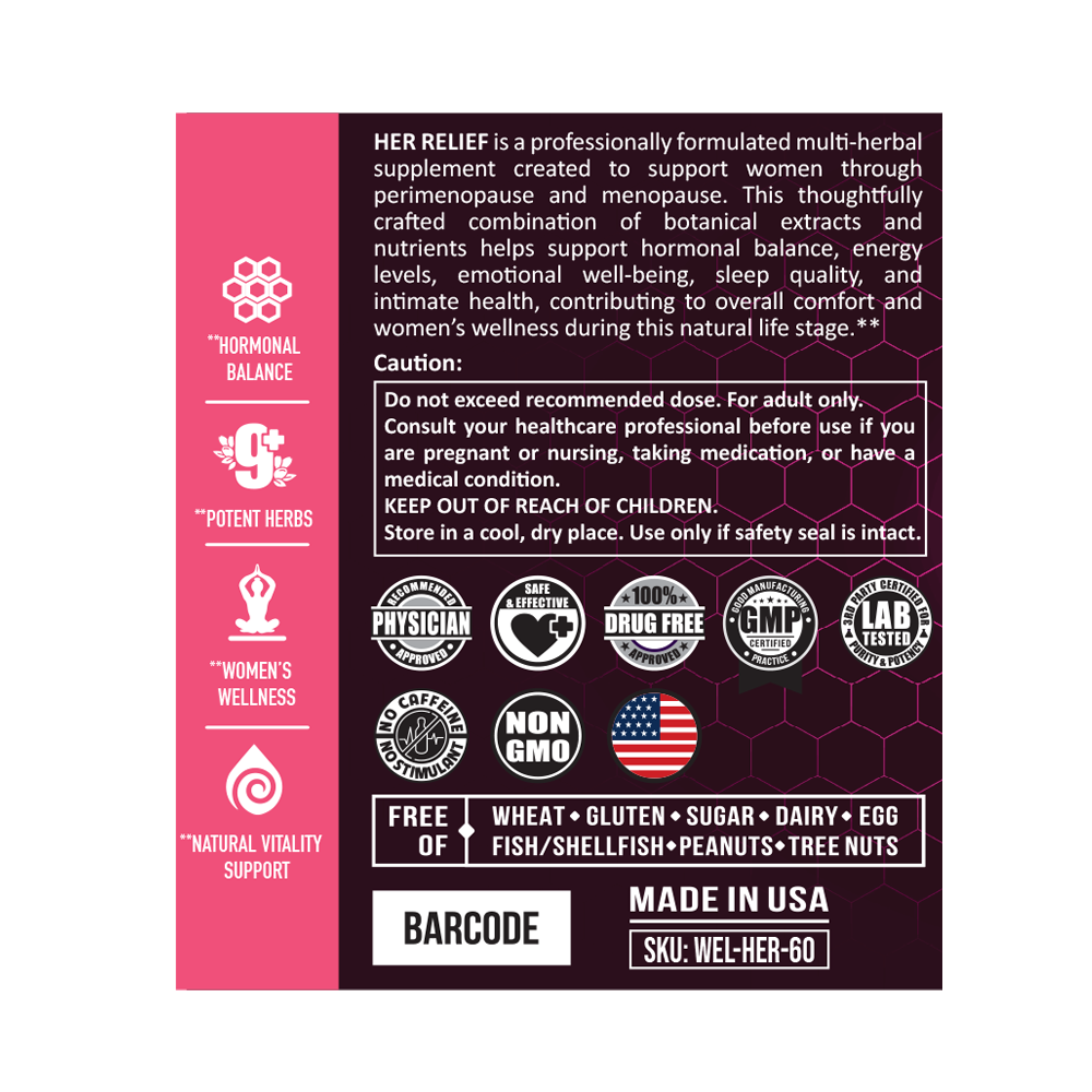 Hormonal transitions don’t have to take over your life. HER RELIEF is a daily, non-hormonal supplement designed to support women through perimenopause and menopause by promoting hormone balance, comfort, and overall wellness—naturally.